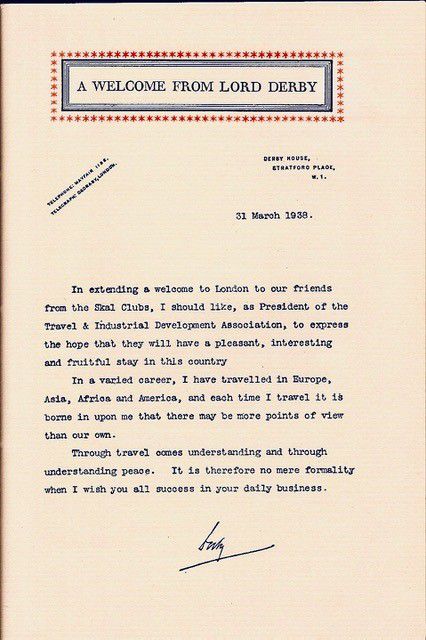 Twenty-nine clubs attended from 15 countries. Congress had great official support. The Lord Mayor of the city chaired the London Skål Club. The published program was simple, beginning with a welcome letter, dated 31 March, and signed by Lord Derby, President of the Travel & Industrial Development Association. "Through travel comes understanding, and through understanding comes peace...". The congress was made possible thanks to the assistance provided by sponsors. I think the investment they made then and their faith in tourism were significant.